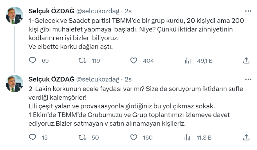 “1-Gelecek ve Saadet partisi TBMM’de bir grup kurdu, 20 kişiydi ama 200 kişi gibi muhalefet yapmaya başladı. Niye? Çünkü iktidar zihniyetinin kodlarını en iyi bizler biliyoruz. Ve elbette korku dağları aştı.