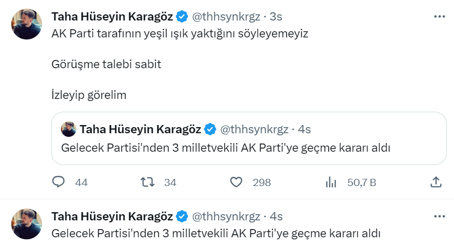 Karagöz, sosyal medya hesabı üzerinden dile getirdiği iddiada önce “Gelecek Partisi’nden 3 milletvekili AK Parti’ye geçme kararı aldı” paylaşımını yaptı. Bir süre sonra geri adım atan AK Partili trol, “AK Parti tarafının yeşil ışık yaktığını söyleyemeyiz Görüşme talebi sabit İzleyip görelim” ifadelerini kullanarak bir paylaşım daha yaptı.