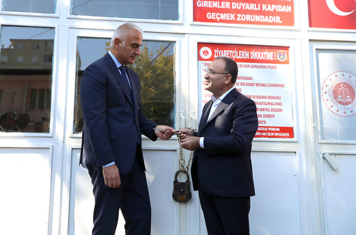 Diyarbakır Cezaevi’ndeki incelemesinin ardından kapıyı kilitleyen Bakan Bozdağ, anahtarı Kültür ve Turizm Bakanı Ersoy’a teslim etti.