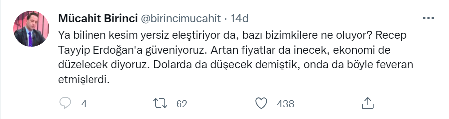 “Ya bilinen kesim yersiz eleştiriyor da, bazı bizimkilere ne oluyor? Recep Tayyip Erdoğan’a güveniyoruz. Artan fiyatlar da inecek, ekonomi de düzelecek diyoruz. Dolarda da düşecek demiştik, onda da böyle feveran etmişlerdi.”