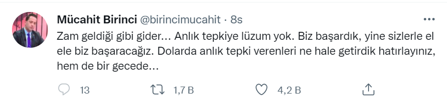 AK Parti MKYK üyesi Mücahit Birinci, kişisel sosyal medya hesabı üzerinden zamlara ilişkin bir değerlendirme yaparak doların düşüşünü hatırlattı. Birinci, paylaşımında “Zam geldiği gibi gider… Anlık tepkiye lüzum yok. Biz başardık, yine sizlerle el ele biz başaracağız. Dolarda anlık tepki verenleri ne hale getirdik hatırlayınız, hem de bir gecede…” ifadelerine yer verdi.