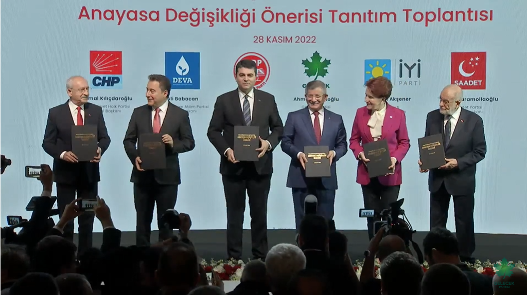 CHP, İYİ Parti, Saadet Partisi, DEVA, Gelecek Partisi ve Demokrat Parti liderlerinin oluşturduğu Altılı Masa, aylardır üzerinde çalıştığı ‘Güçlendirilmiş Parlamenter Sistem’e ilişkin anayasa değişikliği önerisini tamamladı. Altılı Masa’nın “Şimdi Demokrasi Zamanı” sloganıyla düzenlediği tanıtım toplantısı, ‘Güçlendirilmiş Parlamenter Sistem Mutabakat Metni’nin 28 Şubat 2022’de ilan edildiği Bilkent Otel’de yapıldı.