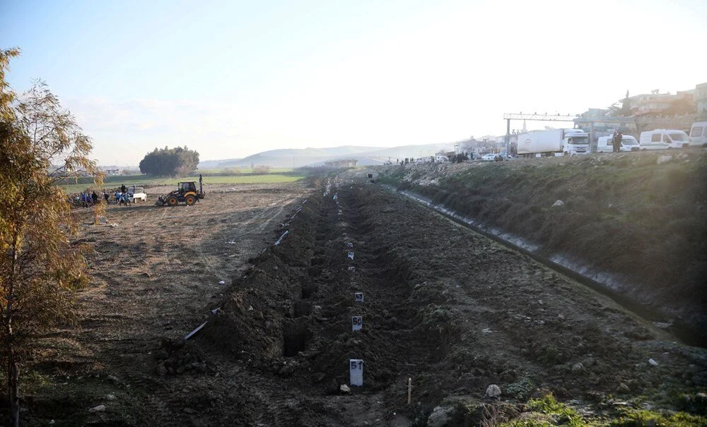 Depremin ağır hasar verdiği illerden Hatay’ın Antakya ilçesinde, ‘deprem mezarlığı’ oluşturuldu. Kepçeler tarafından kazılan ve numaralandırılan isimsiz mezarlara dualar eşliğinde defin yapılıyor.