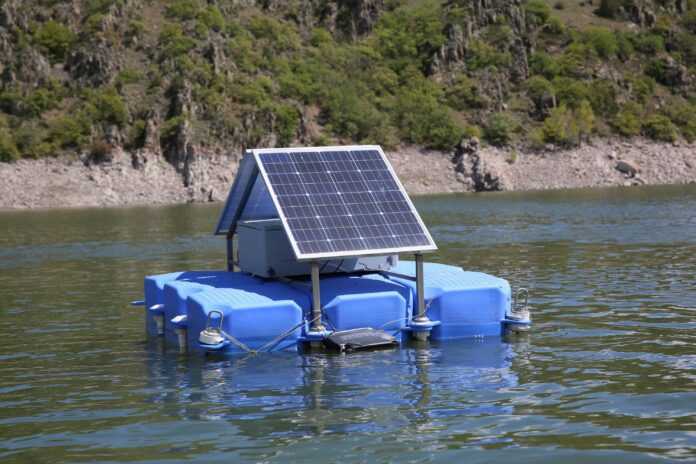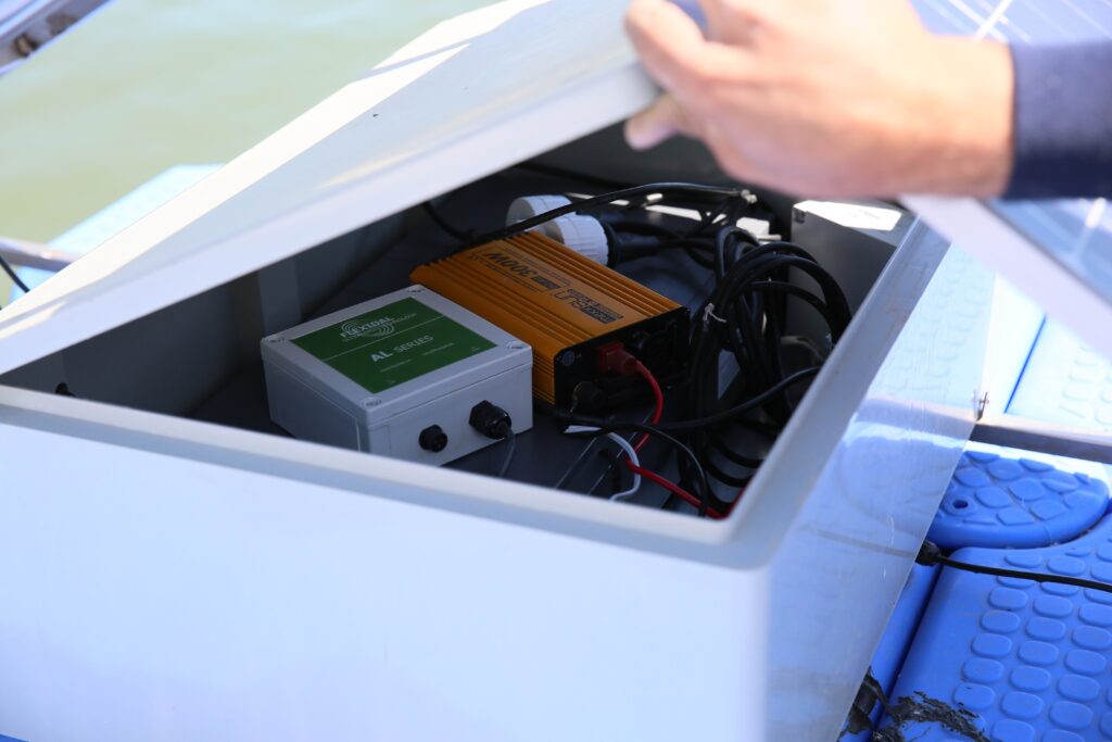 Türkiye’de ilk kez yenilenebilir enerji kullanılarak dizayn edilen çevre dostu sistem; su içinde bulunan balık, yumuşakçalar ve kabuklu canlılara zarar vermeden 0,3-200 khz aralığında ses dalgaları göndererek barajdaki alg kontrolünü sağlıyor. 2 monokristal güneş panelinin 12 volt enerji ürettiği sistem bu sayede kıyıdan bağımsız hareket ederken, her bir platform üzerinde 1 akü, 1 inverter, 1 solar şarj regülatörü ve 2 ultrasonic ses cihazı kontrol paneli yer alıyor. Farklı yönlere ses dalgası gönderebilecek şekilde monte edilen sistem ayrıca 360 derece koruma sağlayarak, 300 metre çapındaki alanı kontrol altında tutabiliyor.