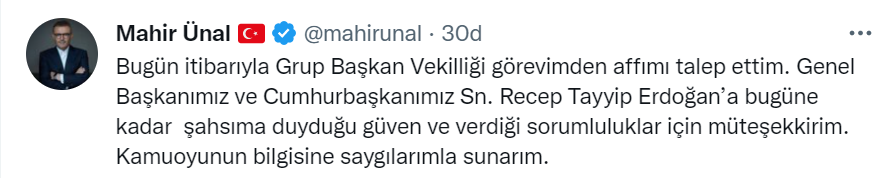 AK Parti Grup Başkanvekili Mahir Ünal, sosyal medya hesabından yaptığı paylaşımda, AK Parti Grup Başkanvekilliği görevinden affını talep ettiğini belirtti.
