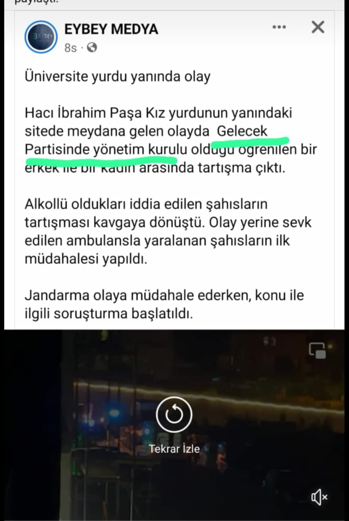 Bartın ilinde yerel habercilik yapmakta olan EYBEY MEDYA isimli kuruluşa ait sosyal medya platformu Facebook sayfası üzerinden 25.08.2022 tarihinde gece saatlerinde "… Hacı İbrahim Paşa Kız Yurdunun yanında sitede meydana gelen olayda Gelecek Partisi yönetim kurulunda olduğu öğrenilen bir erkek ile bir kadın arasında tartışma çıktı. Alkollü oldukları iddia edilen şahısların tartışması kavgaya dönüştü. Olay yerine sevk edilen ambulansla yaralanan şahısların ilk müdahalesi yapıldı. …." şeklinde bir haber paylaşılmış ve diğer haber sitelerine servis edilmiştir.