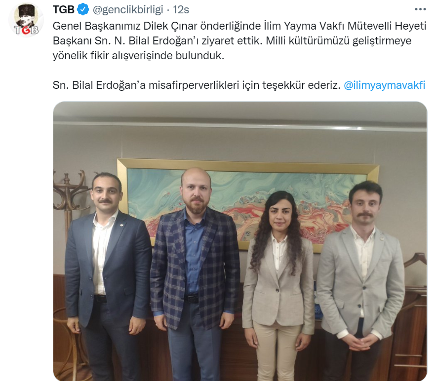 TGB tarafından paylaşılan mesajda, “Genel Başkanımız Dilek Çınar önderliğinde İlim Yayma Vakfı Mütevelli Heyeti Başkanı Sn. N. Bilal Erdoğan’ı ziyaret ettik. Milli kültürümüzü geliştirmeye yönelik fikir alışverişinde bulunduk. Sn. Bilal Erdoğan’a misafirperverlikleri için teşekkür ederiz” ifadelerine yer verildi.