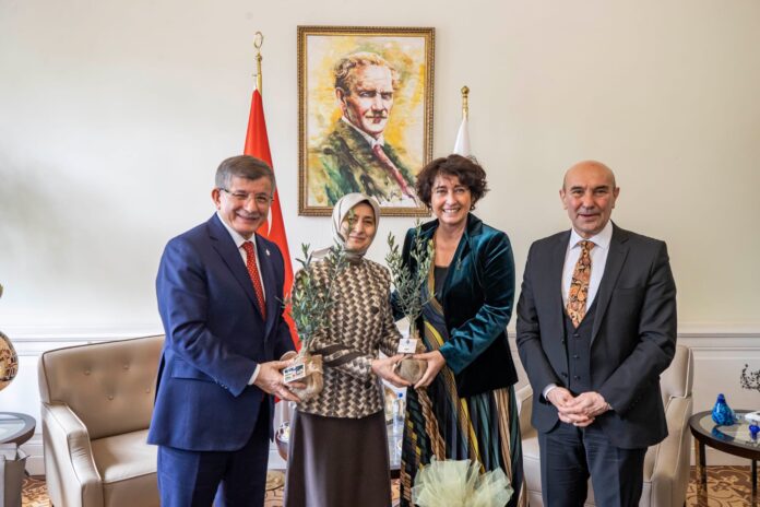 İzmir Büyükşehir Belediye Başkanı Tunç Soyer’in eşi Neptün Soyer’in de hazır bulunduğu ziyarette Ahmet Davutoğlu, Soyer’e kendi yazmış olduğu Medeniyetler ve Şehirler kitabını hediye etti.