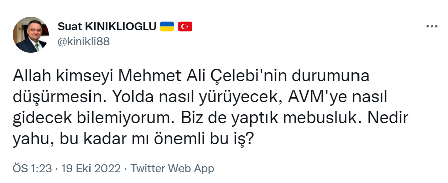 Kınıklıoğlu, sosyal medya hesabından yaptığı paylaşımda, “Allah kimseyi Mehmet Ali Çelebi’nin durumuna düşürmesin. Yolda nasıl yürüyecek, AVM’ye nasıl gidecek bilemiyorum. Biz de yaptık mebusluk. Nedir yahu, bu kadar mı önemli bu iş?” ifadelerini kullandı.