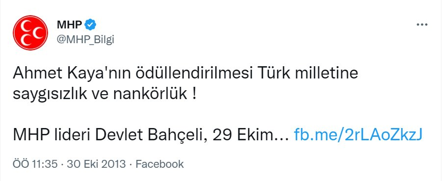 Söz konusu twette şu ifadelere yer verildi: “Ahmet Kaya’nın ödüllendirilmesi Türk milletine saygısızlık ve nankörlük !”