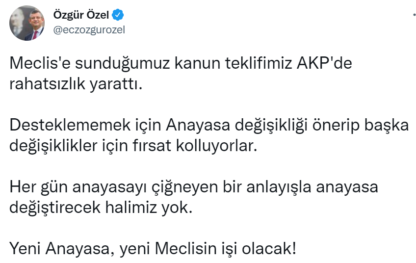 "Meclis'e sunduğumuz kanun teklifimiz AKP'de rahatsızlık yarattı. Desteklememek için Anayasa değişikliği önerip başka değişiklikler için fırsat kolluyorlar. Her gün anayasayı çiğneyen bir anlayışla anayasa değiştirecek halimiz yok. Yeni Anayasa, yeni Meclisin işi olacak!"