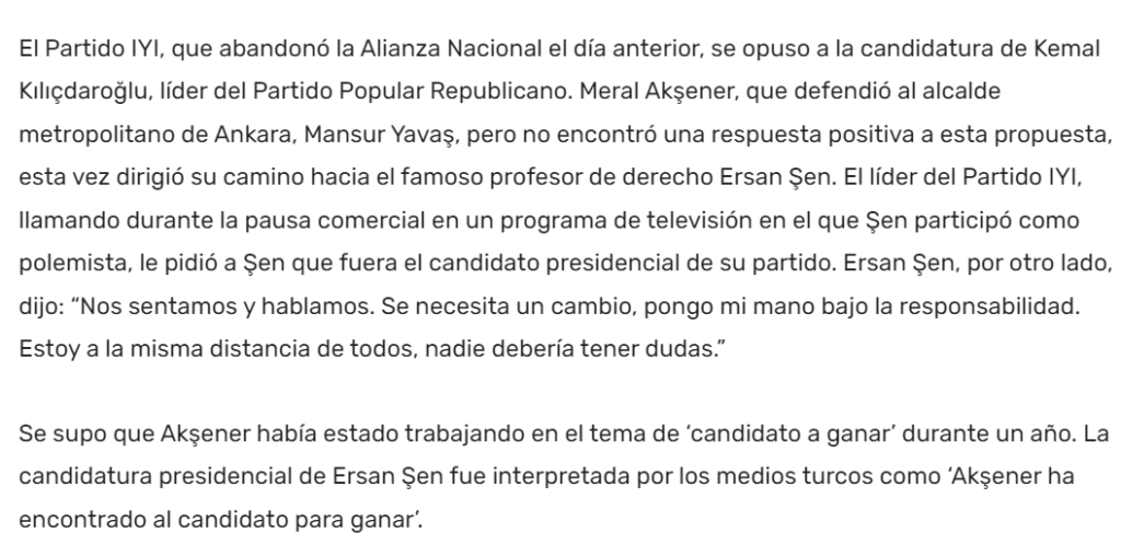 “El Partido IYI, que abandonó la Alianza Nacional el día anterior, se opuso a la candidatura de Kemal Kılıçdaroğlu, líder del Partido Popular Republicano. Meral Akşener, que defendió al alcalde metropolitano de Ankara, Mansur Yavaş, pero no encontró una respuesta positiva a esta propuesta, esta vez dirigió su camino hacia el famoso profesor de derecho Ersan Şen. El líder del Partido IYI, llamando durante la pausa comercial en un programa de televisión en el que Şen participó como polemista, le pidió a Şen que fuera el candidato presidencial de su partido. Ersan Şen, por otro lado, dijo: “Nos sentamos y hablamos. Se necesita un cambio, pongo mi mano bajo la responsabilidad. Estoy a la misma distancia de todos, nadie debería tener dudas.”