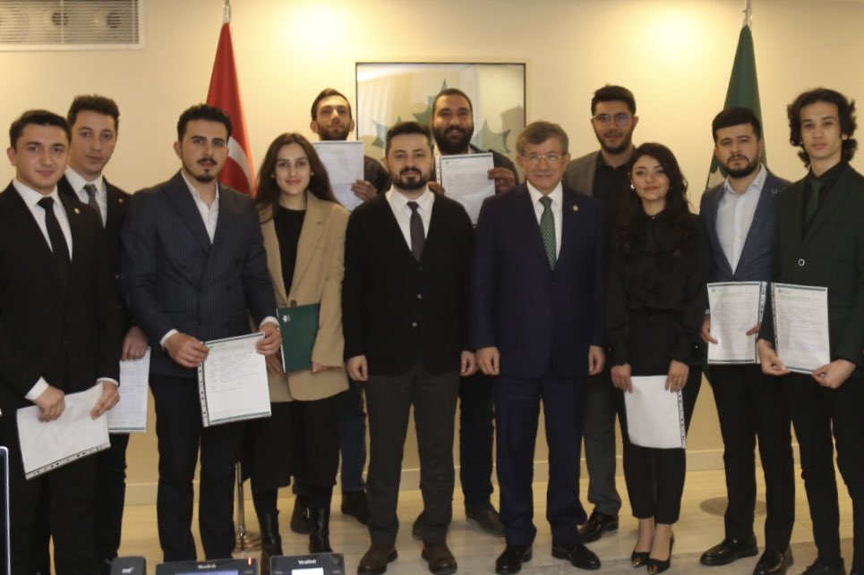Başvuru evraklarını Seçim ve Hukuk İşleri Başkanı Ayhan Sefer Üstün’e teslim eden Gençlik Politikaları yöneticileri, sonrasında Genel Başkan Ahmet Davutoğlu ile bir hatıra fotoğrafı çektirdi.