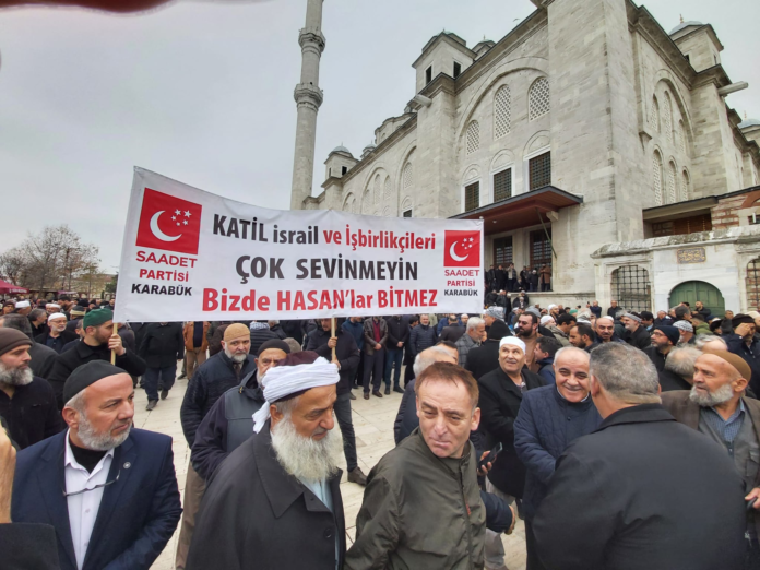 54 yaşında hayatını kaybeden Saadet Partisi Kocaeli Milletvekili Hasan Bitmez için Fatih Camisi’nde tören düzenlendi. Törende “Katil İsrail ve işbirlikçileri çok sevinmeyin bizde Hasanlar Bitmez” pankartı açıldı.