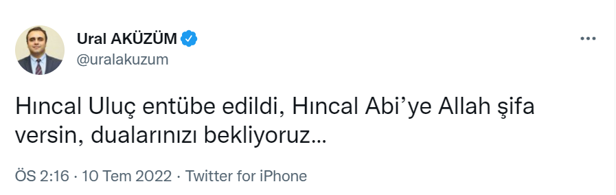 Aküzüm, paylaşımında “Hıncal Uluç entübe edildi, Hıncal Abi’ye Allah şifa versin, dualarınızı bekliyoruz…” ifadelerine yer verdi.