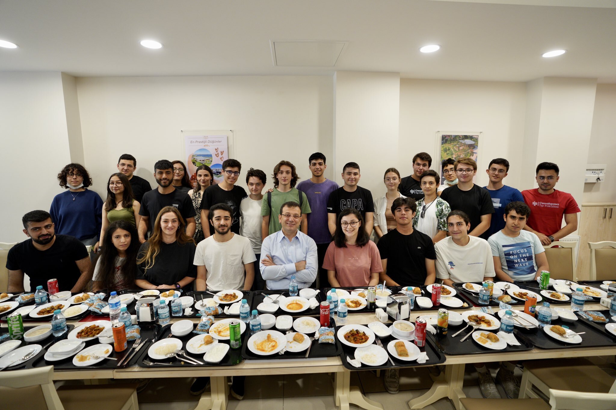 Değerlendirme konuşmasının ardından tezgahın önüne geçen İmamoğlu, kendi tabldotunu alıp CHP İBB Meclis Grup Başkanvekili Doğan Subaşı, İBB Genel Sekreteri Can Akın Çağlar ve Genel Sekreter Yardımcısı Murat Yazıcı ile birlikte öğrencilerin arasına oturdu.