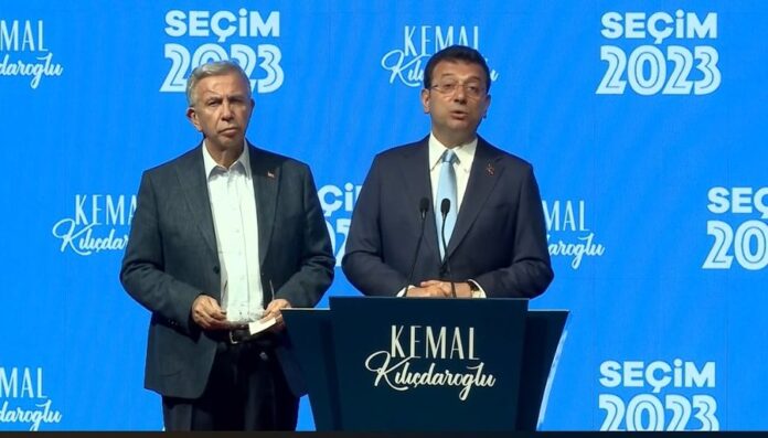 Açılan sandık oranının yüzde 23,87 olduğunu söyleyen İmamoğlu ve Yavaş “Biz şu anda net olarak öndeyiz” ifadelerini kullandılar.