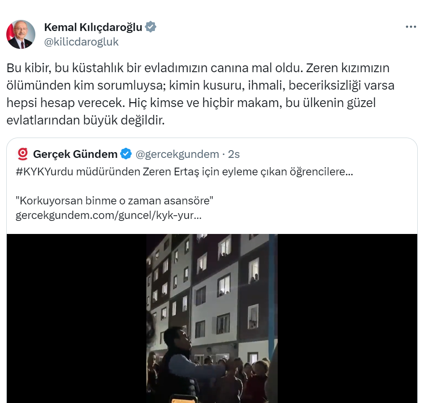 Kılıçdaroğlu paylaşımında “Bu kibir, bu küstahlık bir evladımızın canına mal oldu. Zeren kızımızın ölümünden kim sorumluysa; kimin kusuru, ihmali, beceriksizliği varsa hepsi hesap verecek. Hiç kimse ve hiçbir makam, bu ülkenin güzel evlatlarından büyük değildir” ifadelerine yer verdi.
