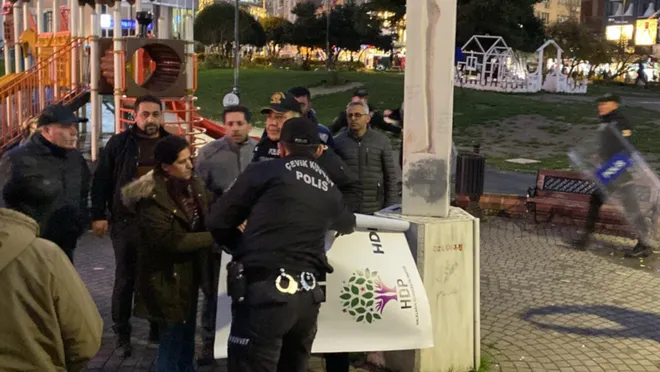 Polis engeline rağmen HDP’liler binadan çıkarak Sabri Yalım Parkı’na gitti. Burada pankart açarak basın açıklaması yapmak isteyen partililer polis engeliyle karşılaştı.