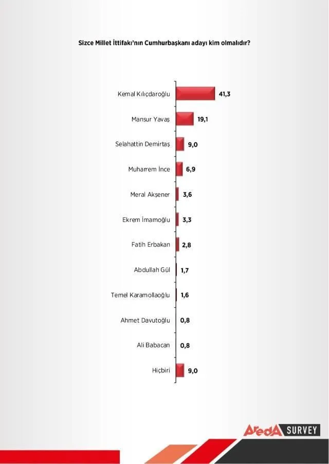 Ankete katılanların yüzde 41.3’ü “Millet İttifakı’nın adayı kim olmalı” sorusuna, Kemal Kılıçdaroğlu yanıtını verdi.
