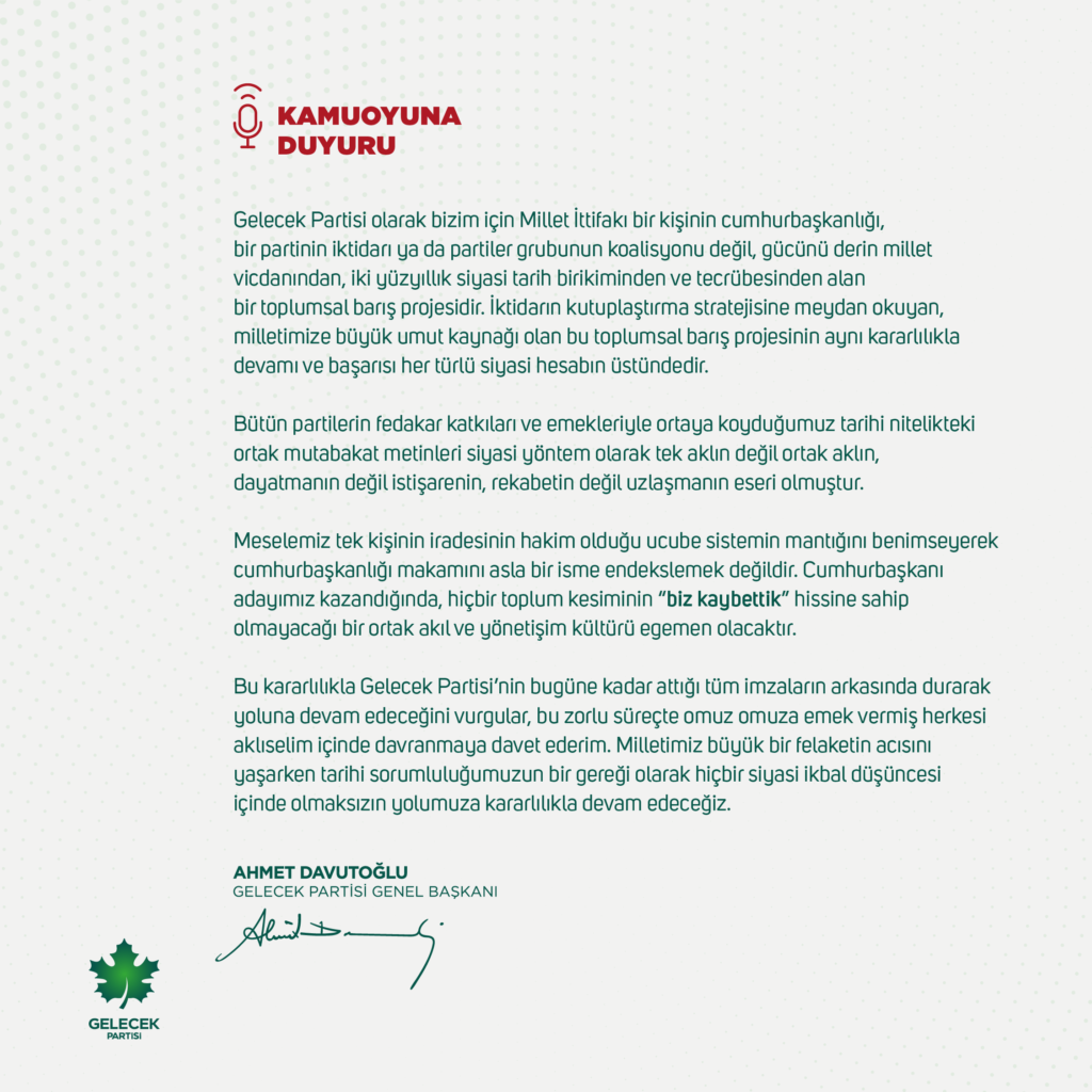 Gelecek Partisi olarak bizim için Millet İttifakı bir kişinin cumhurbaşkanlığı,