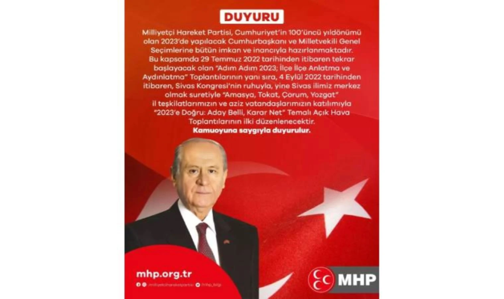 MHP, resmi internet sitesinden yayınladığı duyuruda, 2023 Cumhurbaşkanlığı ve Milletvekilleri seçimi için 29 Temmuz itibariyle sahaya inileceğini ve 4 Eylül’den itibaren kapsamlı mitingler düzenleneceğini açıkladı.