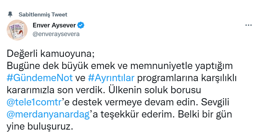Aysever Twitter’dan yaptığı paylaşımda, “Değerli kamuoyuna; Bugüne dek büyük emek ve memnuniyetle yaptığım Gündeme Not ve Ayrıntılar programlarına karşılıklı kararımızla son verdik. Ülkenin soluk borusu TELE1’e destek vermeye devam edin. Sevgili Merdan Yanardağ’a teşekkür ederim. Belki bir gün yine buluşuruz” ifadelerini kullandı.