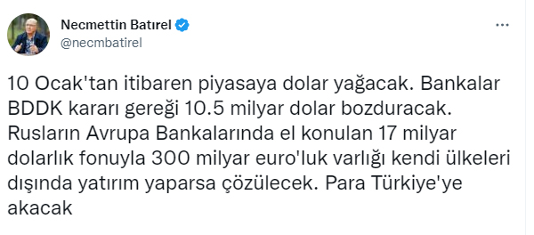Necmettin Batırel, sosyal medya hesabından yaptığı paylaşımda “10 Ocak’tan itibaren piyasaya dolar yağacak. Bankalar BDDK kararı gereği 10.5 milyar dolar bozduracak. Rusların Avrupa Bankalarında el konulan 17 milyar dolarlık fonuyla 300 milyar euro’luk varlığı kendi ülkeleri dışında yatırım yaparsa çözülecek. Para Türkiye’ye akacak” dedi.