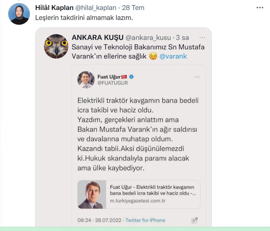 Sabah yazarı ve TRT Yönetim Kurulu üyesi Hilal Kaplan, Fuat Uğur’a verilen para cezasını sert bir dille eleştirerek Bakan Varank’ın yanlış yaptığını söyledi. Kaplan, Varank’ın Fuat Uğur’un ‘elektrikli traktör’ yazısının yanlış olduğunu projeyi hayata geçirerek kanıtlayabileceğini ancak kendisinin bu yolu seçmediğini belirtti.