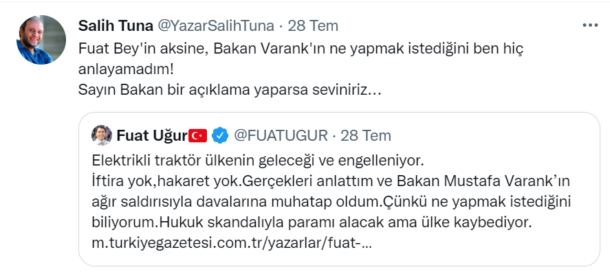 Türkiye Gazetesi yazarı Fuat Uğur, dün kaleme aldığı yazısında elektrikli traktörlere ilişkin 2019 yılında yazdığı bir yazısından dolayı Sanayi ve Teknoloji Bakanı Mustafa Varank’ın kendisine dava açtığını ve bu davayı da Bakan Varank’ın kazandığını yazdı.