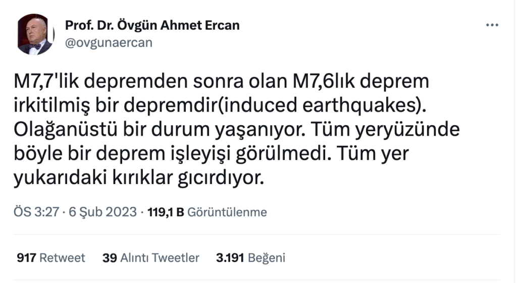 Sosyal medya hesabından paylaşım yapan Prof. Dr. Ercan, “M7,7’lik depremden sonra olan M7,6lık deprem irkitilmiş bir depremdir (induced earthquakes). Olağanüstü bir durum yaşanıyor. Tüm yeryüzünde böyle bir deprem işleyişi görülmedi. Tüm yer yukarıdaki kırıklar gıcırdıyor” diye yazdı.