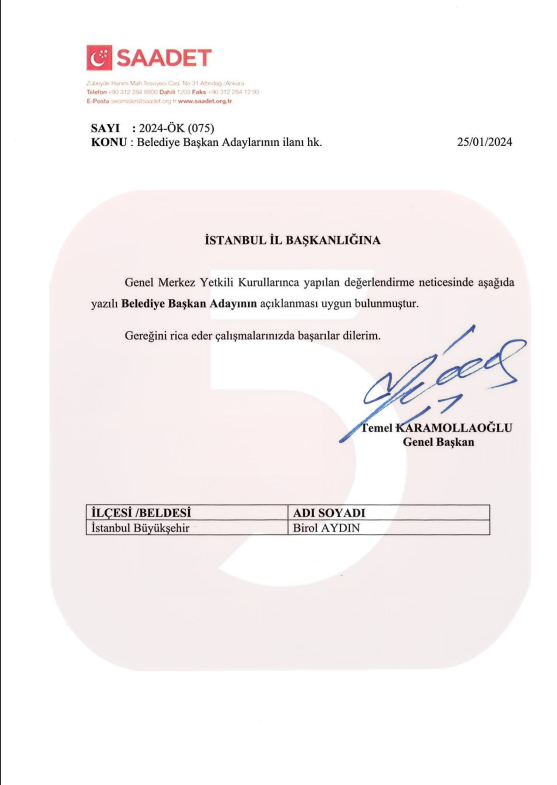 Saadet Partisi kaynaklarından edinilen bilgiye göre, Saadet Partisi’nin İstanbul Büyükşehir Belediye Başkan Adayı İstanbul Milletvekili Birol Aydın oldu.