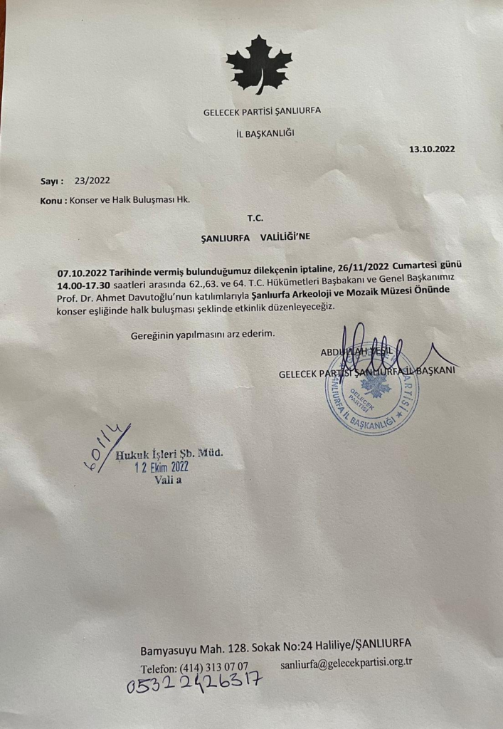 “Genel Başkanımızın katılacağı bir halk buluşması için Şanlıurfa valiliğine 2 defa müracaat ettik. Birincisi 29 Ekim 2022 tarihinde Novada AVM yanında halk buluşması düzenlemek istedik. Tarafımıza trafik aksayacağından olumsuz cevap verildi. İkincisinde ise 26 Kasım 2022 tarihinde Halk buluşması içinde izin talebinde bulunduk ve yine o tarihte AK Parti Genel Başkanının Urfa’da miting yapacaklarını söyleyerek tarafımıza olumsuz cevap verildi. Yine Şanlıurfa valiliği 15 günlük miting ve gösteriler için yasak kararı verdiği halde 15 günlük süre dolmadan AK Parti’ye miting için izin vermiştir”