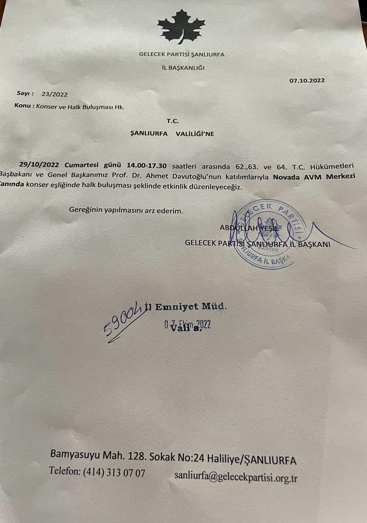 Gelecek Partisi Şanlıurfa İl Başkanı Abdullah Yeşil, kişisel Twitter hesabından yaptığı açıklamada, “Ahmet Davutoğlu’nun 29.10.2022 ve 26.11.2022 tarihinde Şanlıurfa’da Halk Buluşmasına izin vermeyen Valilik, AK Parti Genel Başkanın gelişini neden göstermişti! Valiliğin (21.11.2022-05.12.2022) 15 Günlük yasaklama kararı var. Karar Sadece Muhalefet için mı alındı? Yasak ise AK Parti’ye nasıl izin veriliyor?” diye sordu.