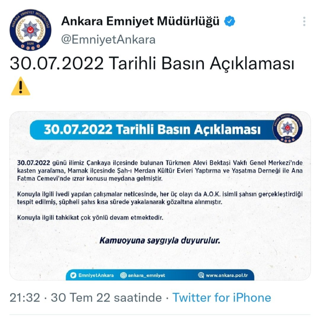 İçişleri Bakanı Soylu, sosyal medya hesabında Ankara Emniyet Müdürlüğü’nün; “30.07.2022 günü ilimiz Çankaya ilçesinde bulunan Türkmen Alevi Bektaşi Vakfı Genel Merkezi, Şah-ı Merdan Kültür Evleri Yaptırma ve Yaşatma Derneği ile Ana Fatma Cemevi’nde ızrar konusu meydana gelmiştir. Konuyla ilgili ivedi yapılan çalışmalar neticesinde, her üç olayı da A.O.K. isimli şahsın gerçekleştirdiği tespit edilmiş, şüpheli şahıs kısa sürede yakalanarak gözaltına alınmıştır” açıklamasını paylaştı.