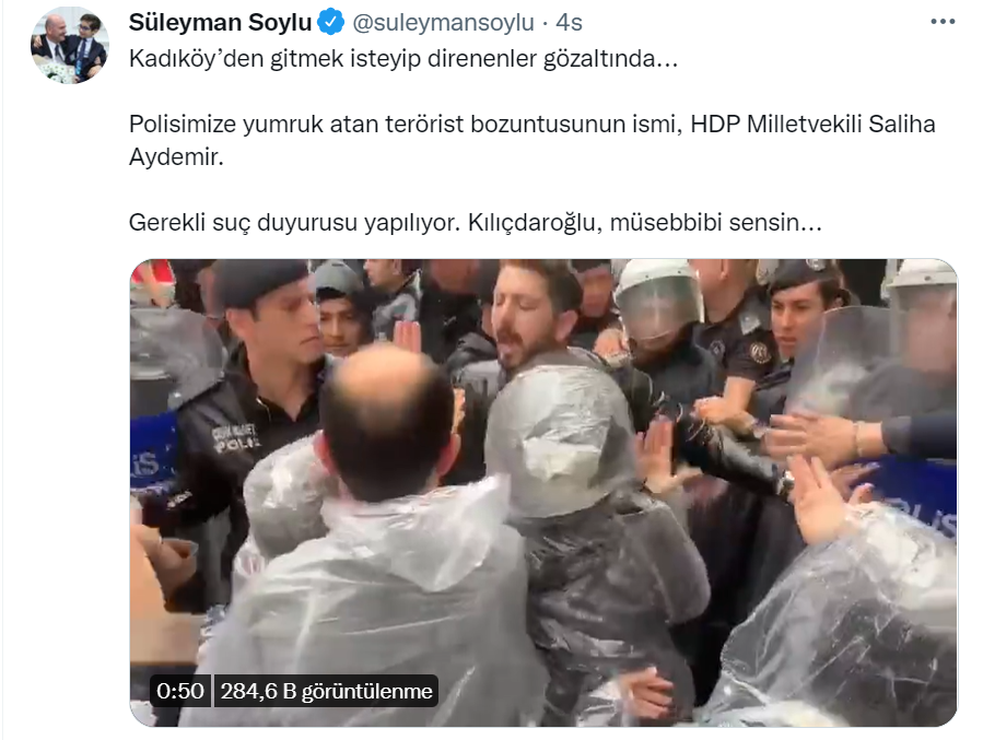 İçişleri Bakanı Süleyman Soylu, HDP Milletvekili Saliha Aydeniz’in polise yumruk attığını belirterek, olaydan CHP lideri Kemal Kılıçdaroğlu’nu sorumlu tuttu.